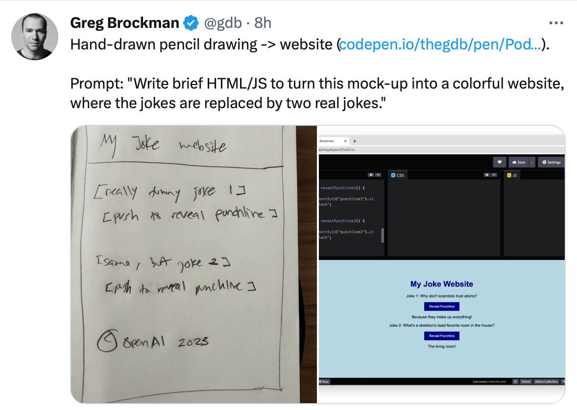 Check out the full release demo, it’s really awesome. GPT-4 can turn a hand drawn sketch into a website.